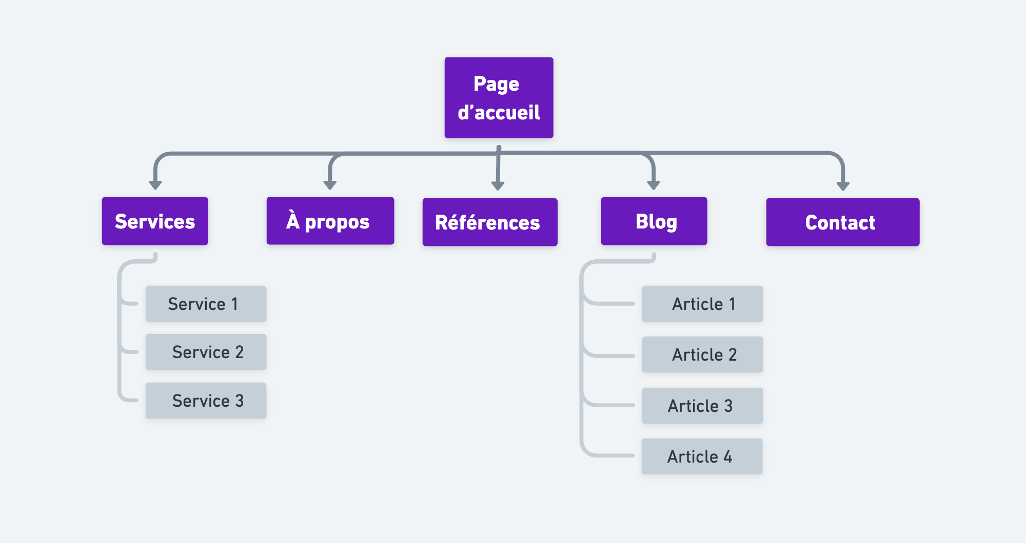 L'arborescence d'un site web désigne la structure hiérarchique et organisationnelle de l'ensemble des pages qui composent votre site. En d'autres termes, il s'agit du squelette de votre site internet, qui définit comment les différentes pages sont reliées entre elles.