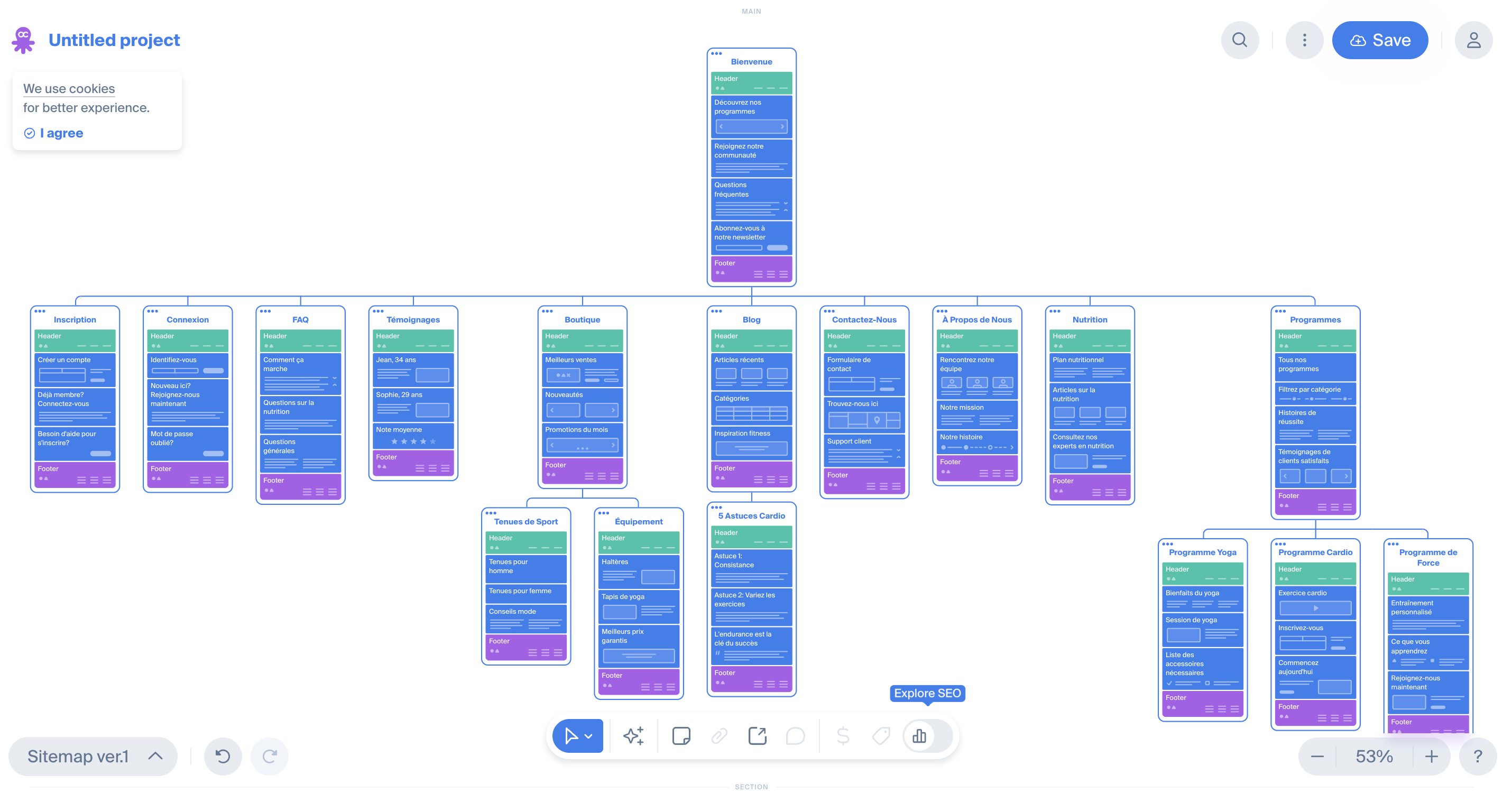 Sa fonctionnalité de sitemap permet de créer des arborescences détaillées avec des annotations et des descriptions pour chaque page.