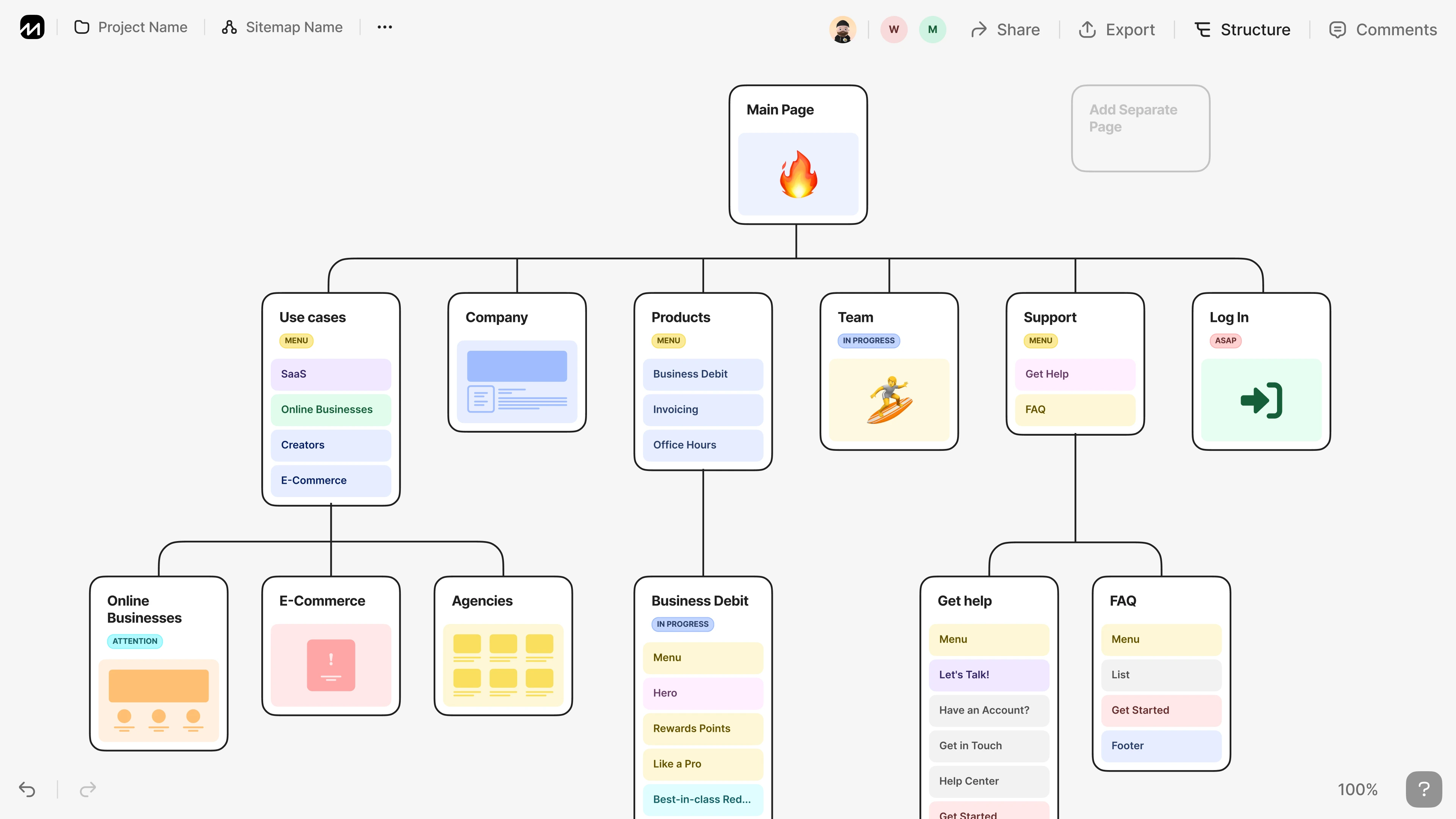Octopus.do est un outil spécialement conçu pour créer des sitemaps et des arborescences de sites web. Son interface intuitive permet de construire visuellement votre structure en glissant-déposant des éléments.